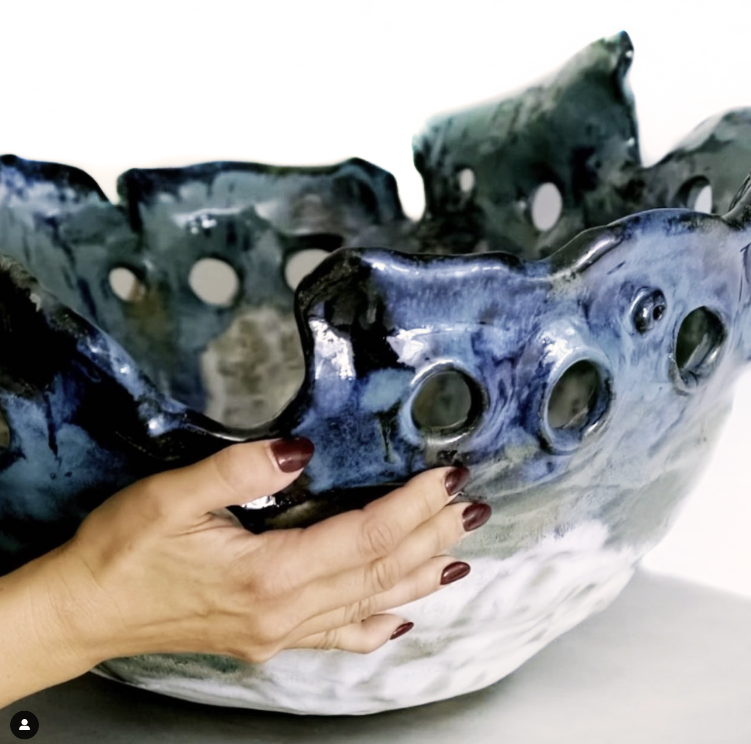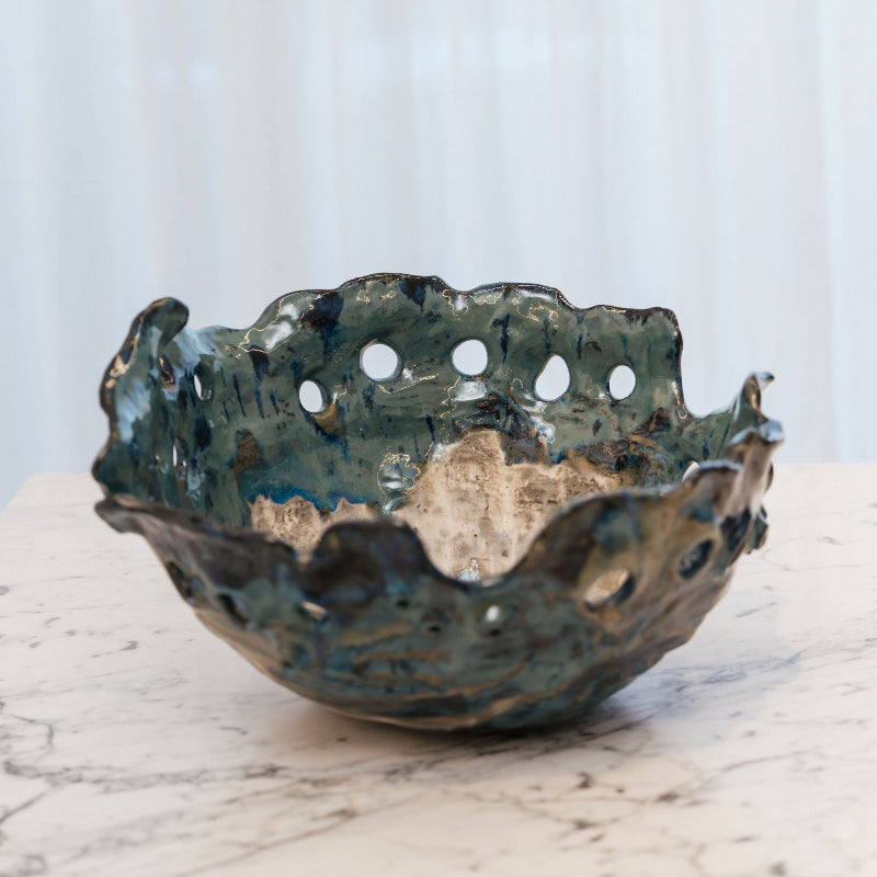Hand-sculpted in stoneware and finished with a rustic matte white base and deep blue gloss glazes, Katie Manekshaw’s Giant Water Bowls are designed to captivate both as functional vessels and as sculptural art objects. Each curve and contour is meticulously shaped by hand, ensuring no two bowls are ever the same.