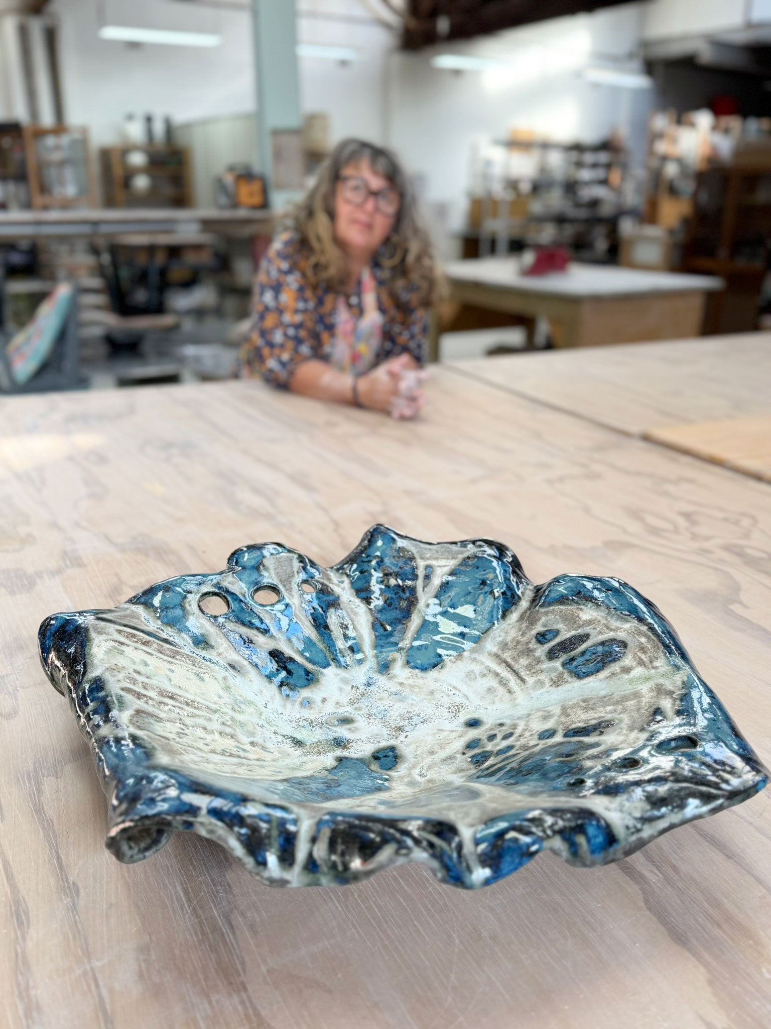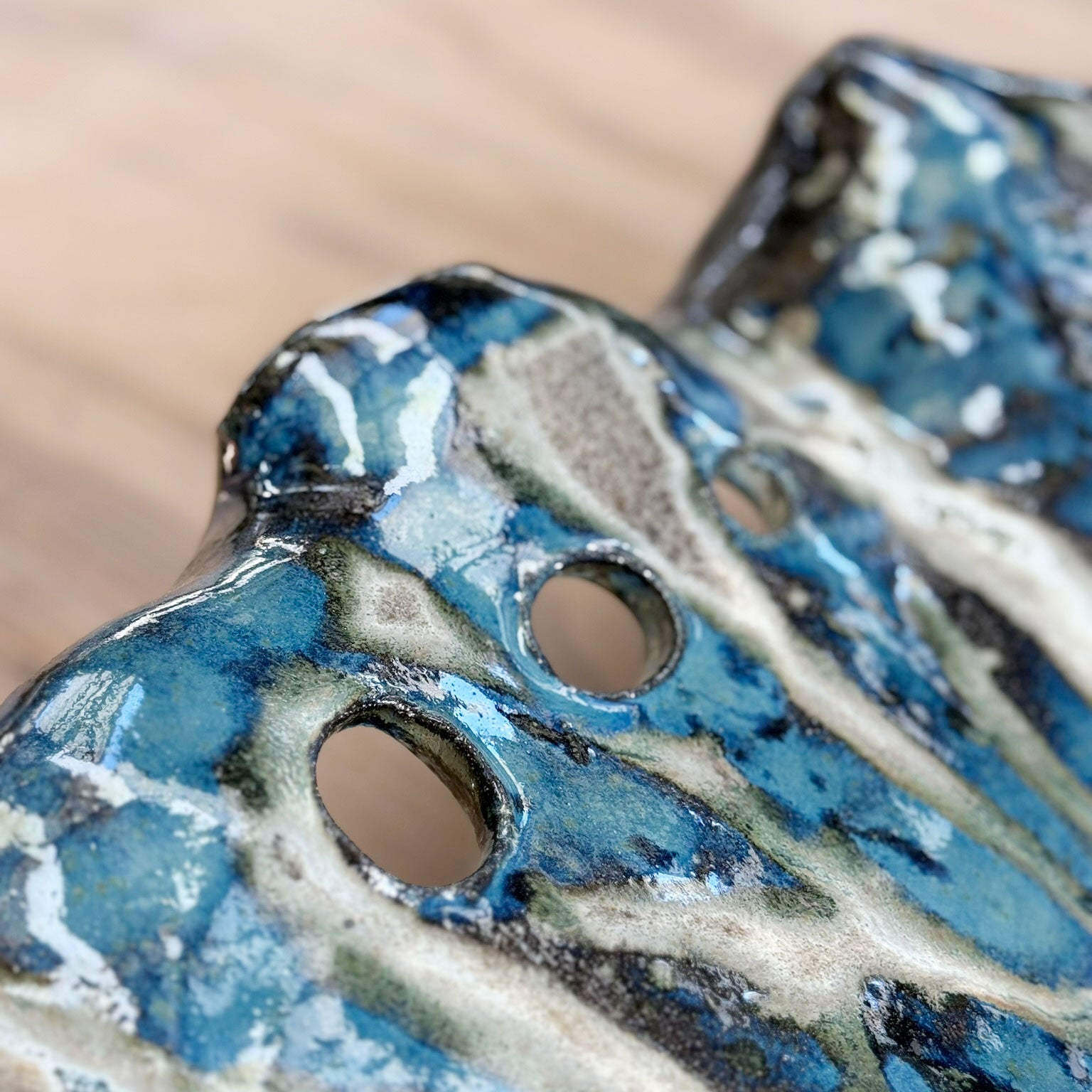 This hand-built platter is a sculptural meditation on the element of water — fluid yet grounding, reflective yet still. Layered glazes drift between deep gloss blues and soft matte whites, catching and releasing light like ripples across the surface of a tide pool.